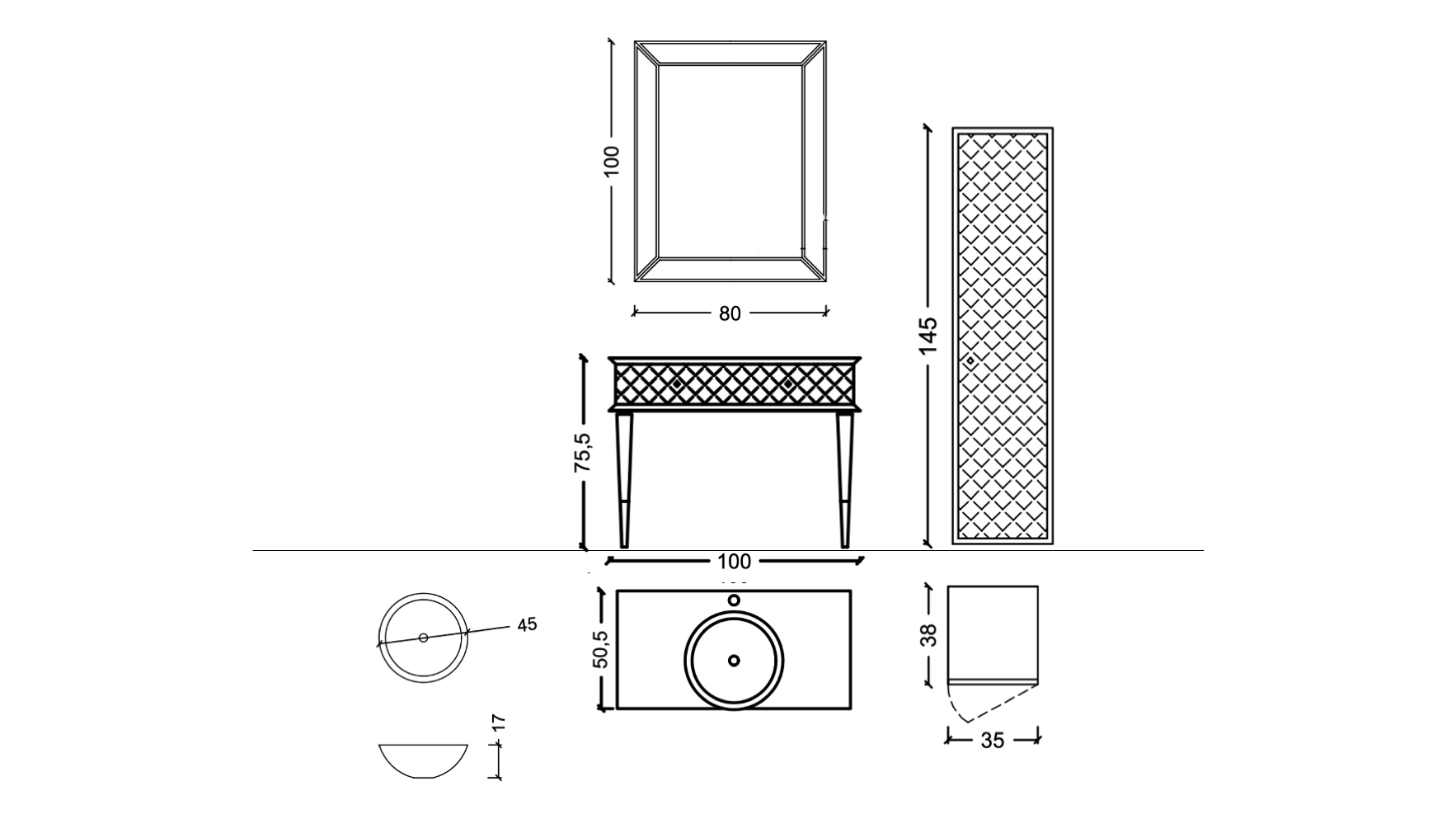 Im Lieferumfang dieses Sets sind ein Waschtisch, ein Waschbecken und der Spiegel enthalten.
