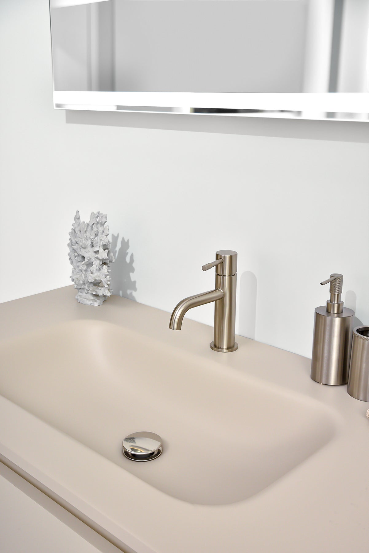 Die Waschtischplatte und das integrierte Becken verschmelzen zu einer einzigen Form, aus einem Guss gefertigt, millimetergenau und vollkommen harmonisch. Der helle Beigeton, entfaltet eine sanfte Wärme und erinnert an die Eleganz von Naturstein – zurückhaltend und doch von unverwechselbarer Präsenz.