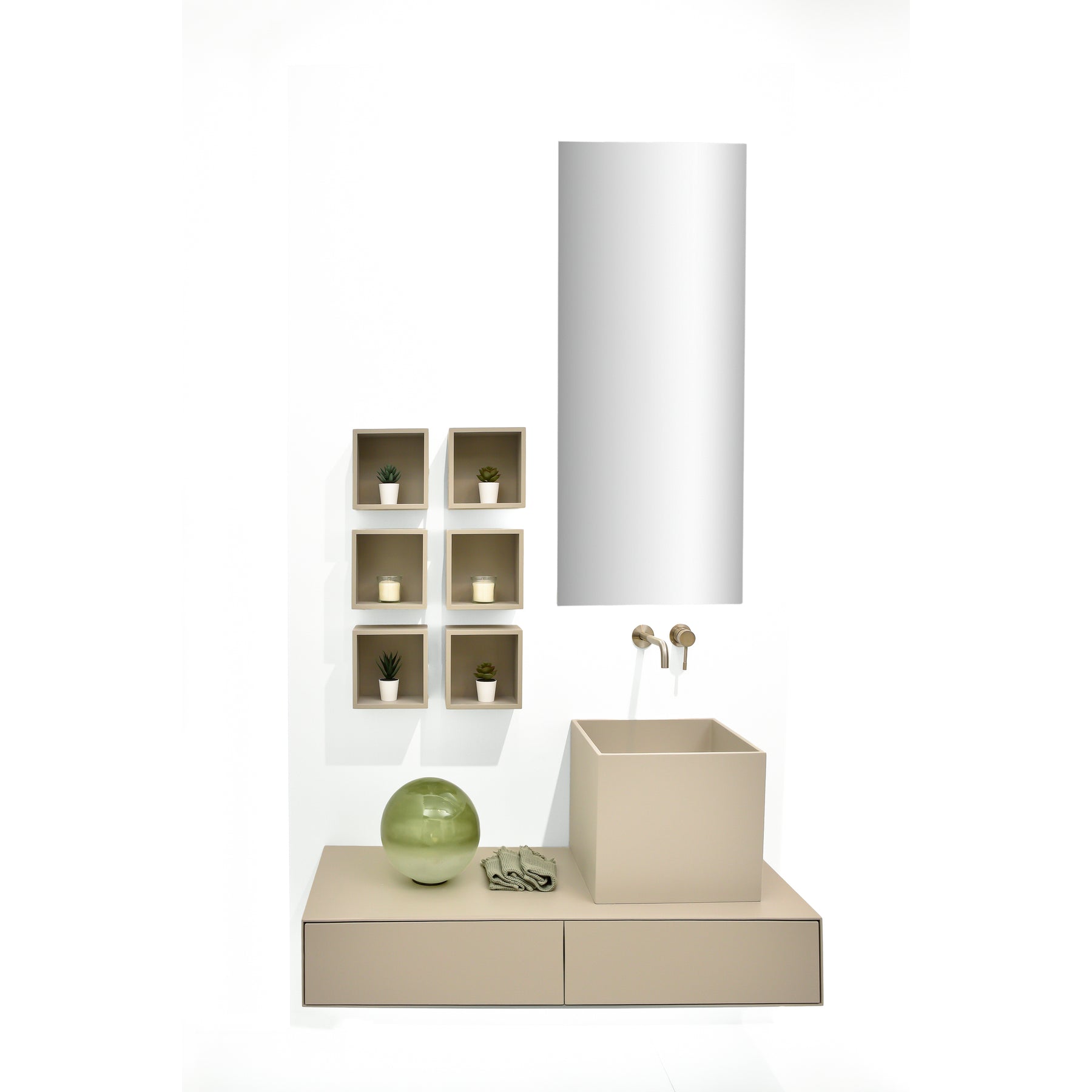 Ein Design, das Ruhe und Präzision inszeniert - aus dem Hause Armadi Art®.Die 60 cm breite Waschtischlösung mit maßgefertigtem Kasten-Waschbecken ruht auf Acryloberflächen in einem speziell kreierten Beige. Die Armatur von Bohéme in gebürstetem Nickel setzt einen sanft schimmernden Akzent, reduziert, hochwertig, zeitlos. Unter dem Becken sorgt eine integrierte Schublade für klare Ordnung, ohne die Linie zu stören.