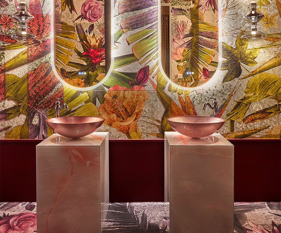 Jeder Stein von Hand ausgewählt und einzeln gesetzt, als Waschtischplatte oder als Paneel für elegante Akzente.