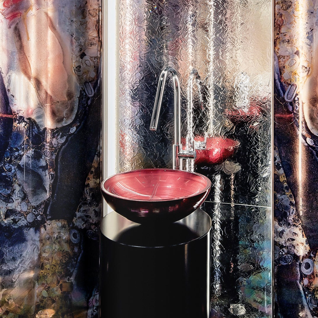 Dieses Glaswaschbecken wird aus hochwertigem, bleifreiem Soda-Lime-Glas gefertigt. Die Innenseite ist in einer sogenannten Rigata-Technik ausgeführt, einer feinen geriffelten Streifenstruktur im Glas, die das einfallende Licht bricht und der Schale eine besondere räumliche Tiefe verleiht.