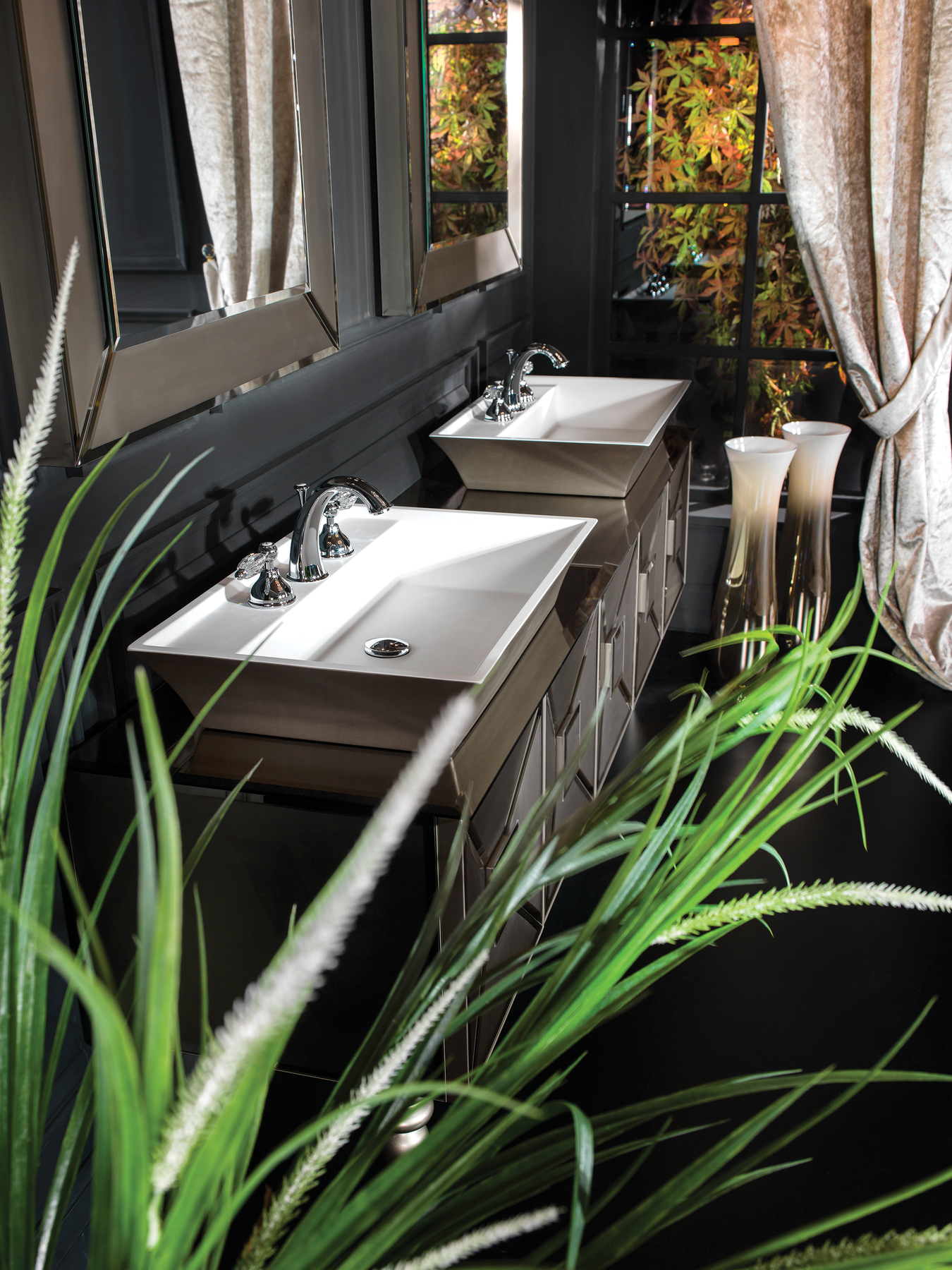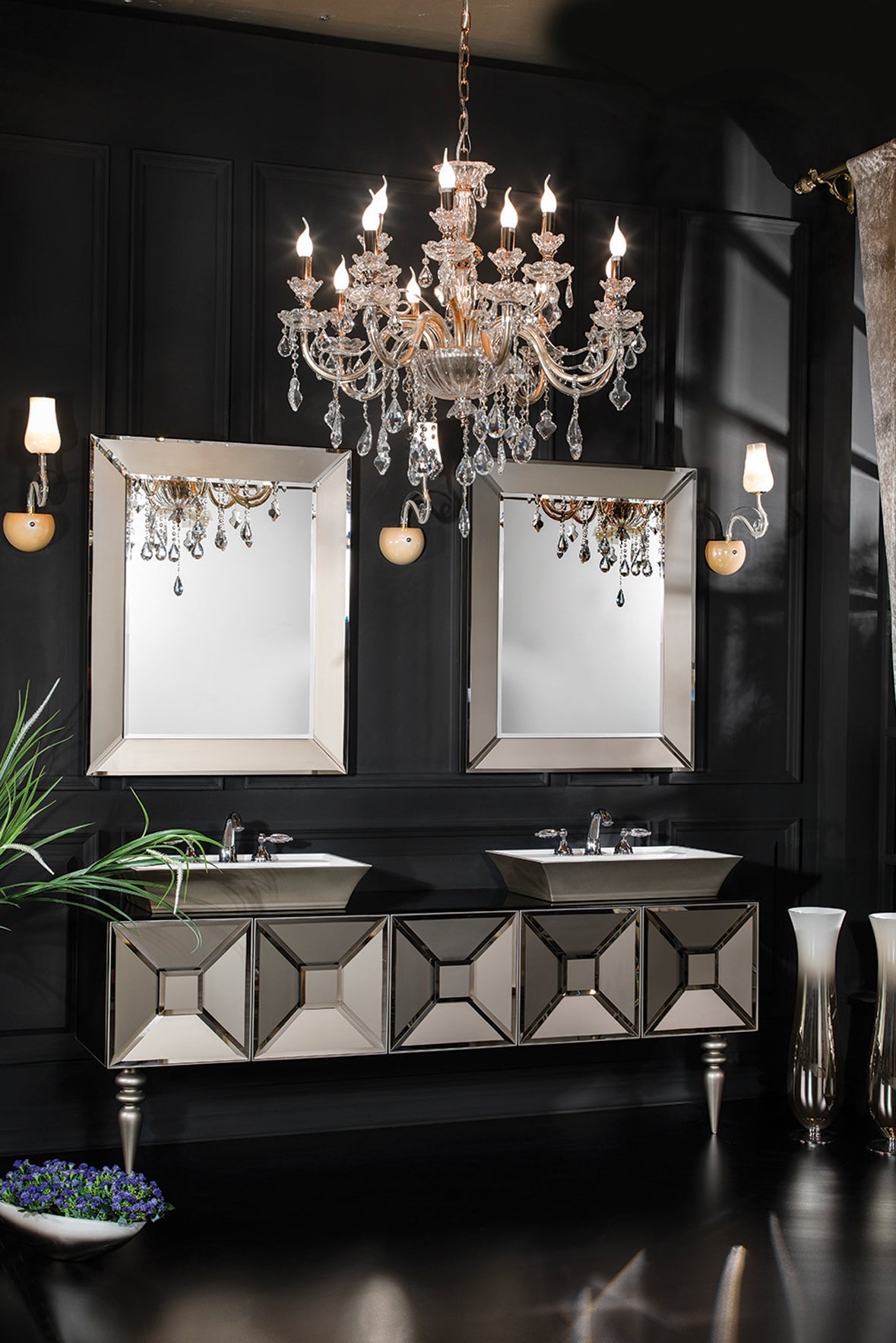 Im Lieferumfang dieses Sets sind zwei Spiegel, ein Waschbeckenunterschrank mit zwei Waschbecken und ein Beischrank enthalten. Wasserhahn und Dekorationsartikel sind nicht enthalten.