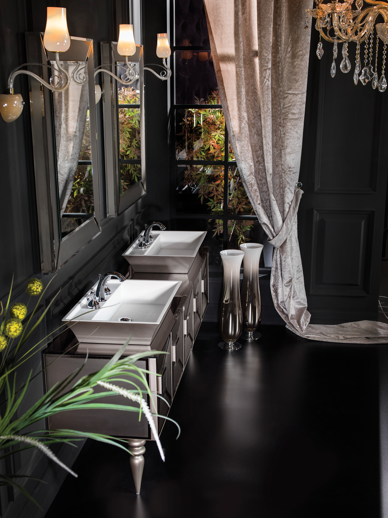 MaterialSpiegel: Spez. MDF-Holz und GlasverkleidungWaschtisch: Aluminiumkörper, Regalfront aus spez. MDF-Holz und Glasverkleidung, Seiten mit Glasverkleidung (4mm)Waschtischplatte: Gehärtete Glasarbeitsplatte (8-10mm), Satine Bronze Glas mit SpiegeleffektWaschbecken: AcrylLackierungSpiegel: HochglanzlackierungWaschtisch: Hochglanzlackierung