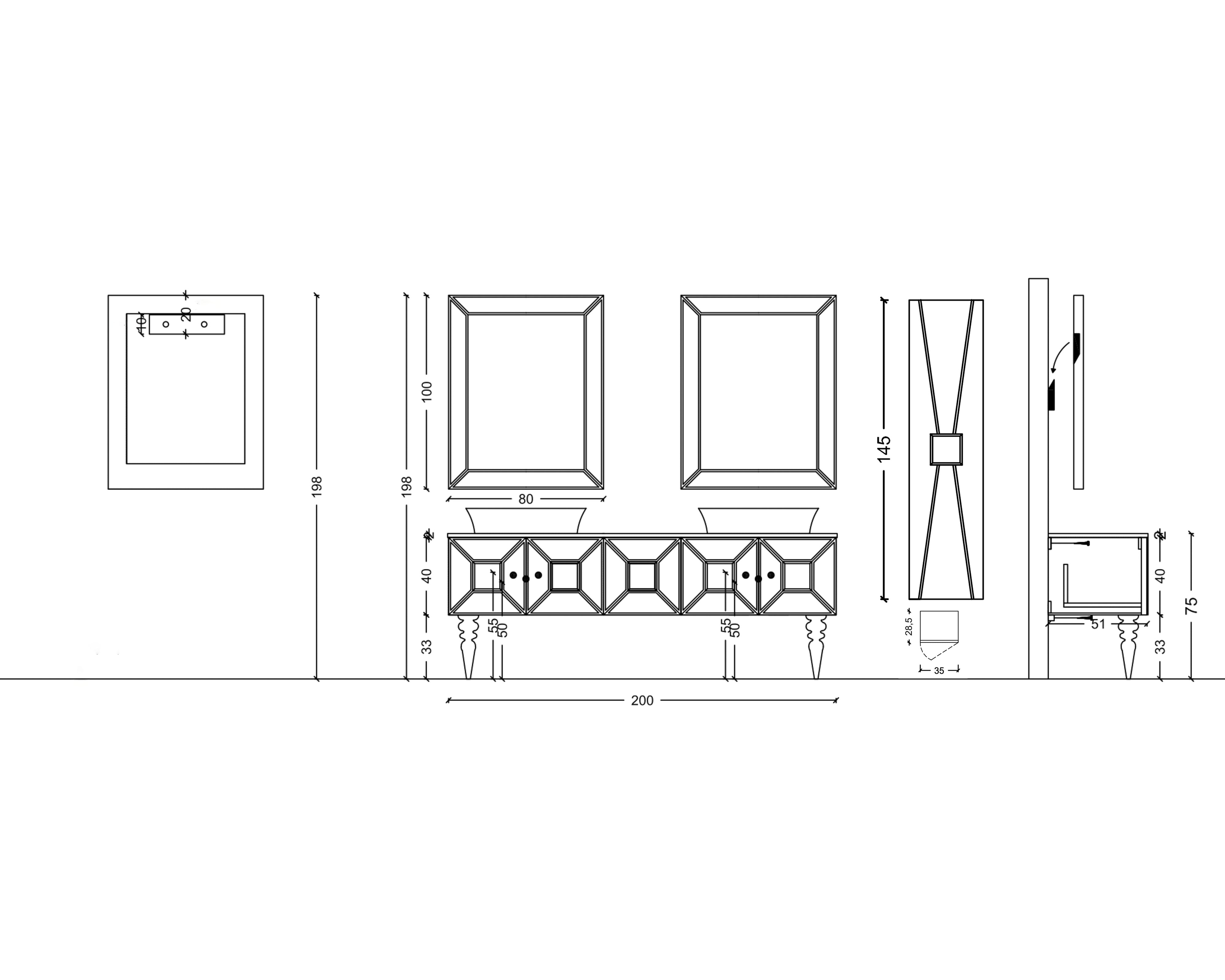 ProduktdimensionenWaschtisch: 200cm x 51cm x 75cmSpiegel: 80cm x 100cmBeischrank: 30cm x 28,5cm x 145cmGewicht: 200kgVerpackungAnzahl Pakete: 7Gesamtgröße: 80cm x 210cm x 120cmGewicht: 251kg